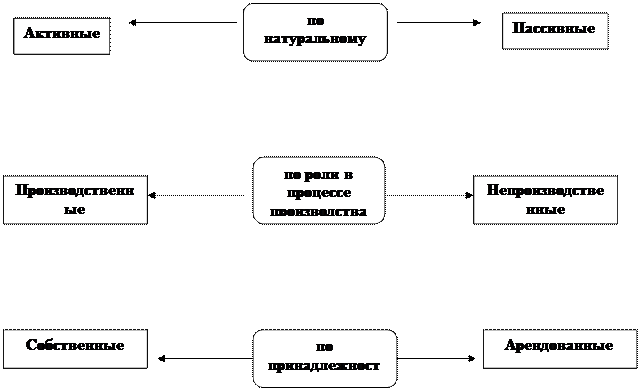 | выполняющие различные функции в производственном процессе (машины, станки, агрегаты и другие) | обеспечивающие нормальное течение производственного процесса (здания, дороги, ремонтные средства и др. |