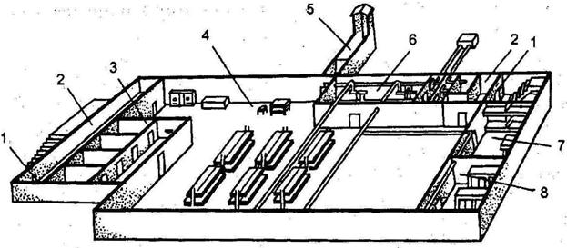 1 — тамбуры, предтамбуры и входы; 2 — тамбуры, шлюзы; 3 — санитарные узлы; 4 — помещения для укрываемых; 5 — выходы; 6 — фильтровентиляционная камера; 7 — медицинская комната; 8 — кладовая для продуктов.