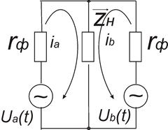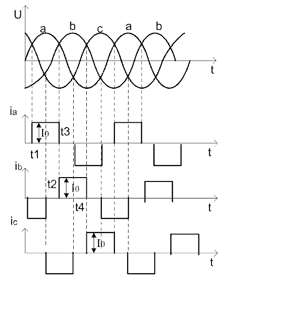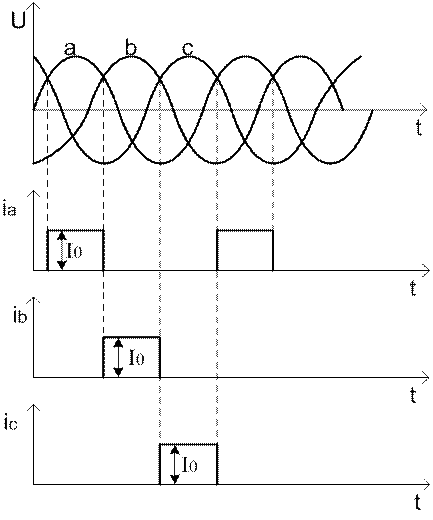 В фазе а протекает положительный ток в момент времени, когда напряжение на фазе а превышает U на других фазах; отрицательный ток протекает, когда напряжение меньше, чем в остальных фазах. Аналогично и для других фаз.