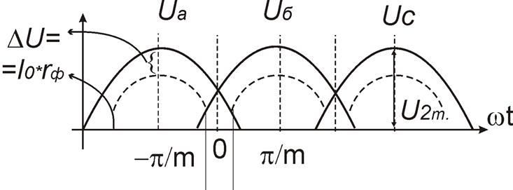 Можно показать что в случае комплексного сопротивления фазы т.е. при наличии индуктивности рассеяния трансформатора имеет место одновременная работа смежных фаз в некотором интервале перекрытия. Причем форма токов в фазах и напряжение на выходе видоизменяются, см рисунок 3.19