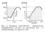 При квантовании по времени кривую f(t) разбивают на равные отрезки по горизонтали (рис, 5, б). Передаются только те значения сигнала х1,x2,x3 и т. д, которые совпадают с