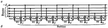 логических схем И, каждая из которых имеет 2 входных диода и резистор. Шины 1, 2, 3 и 4 являются входами дешифратора. К ним подключаются диоды схем И таким образом, что совпадение сигнала 1 (—Е) при каждой кодовой комбинации возможно только на диодных входах одной схемы И. На выходе этой схемы будет также сигнал 1.