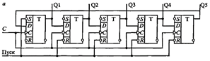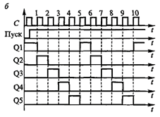 . Простейшим распределителем импульсов является кольцевой сдвигающий счетчик с числом устойчивых состояний, равным числу распределяемых импульсов (см. рис.).