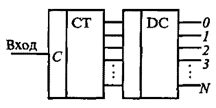 . По мере поступления импульсов на вход С счетчика СТ на его выходах меняется комбинация сигналов, поступающих на входы дешифратора DC. Сигнал переходит последовательно с одного выхода дешифратора на другой. В распределителях могут быть использованы одно- или многоступенчатые дешифраторы. Одноступенчатые дешифраторы в распределителях применяются при числе выходов N<16 (реже при N = 32). При