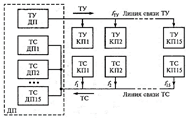 Устройство ТУ имеет общий передающий полукомплект ТУ ДП и индивидуальные приемные ТУ КП 1 -ТУ КП 15. Устройство ТС имеет индивидуальные передающие ТС КП1-ТС КП15 и приемные ТС ДП1-