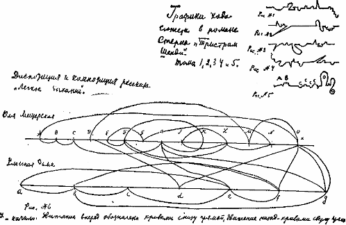 · Попытаемся теперь схематически обозначить то, что автор проделал с этим материалом, придав ему художественную форму. Для этого соединим в порядке композиционной схемы отдельные точки этих прямых в такой последовательности, в какой события даны действительно в рассказе. При этом мы условно будем обозначать кривой снизу всякий переход к событию хронологически более раннему, и кривой сверху всякий переход к событию последующему, хронологически более отдаленному. Мы получим две графические схемы: что изображает эта сложная и путаная на первый взгляд кривая, которая вычерчена на рисунке? Она означает, конечно, только одно: события в рассказе развиваются не по прямой линии52, как это имело бы место в житейском случае, а развертываются скачками.