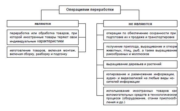 Однако в тех случаях, когда целью переработки является совершение элементарных производственных манипуляций, таможенные режимы переработки с точки зрения интересов государства устанавливать нецелесообразно. Это обусловлено, прежде всего, тем, что выполнение подобных производственных процессов не способствует развитию отечественной промышленности. Поэтому законодательством Таможенного союза был установлен конкретный перечень операций, относящихся и не относящихся к переработке товаров для внутреннего потребления. Они воспроизведены на схеме.