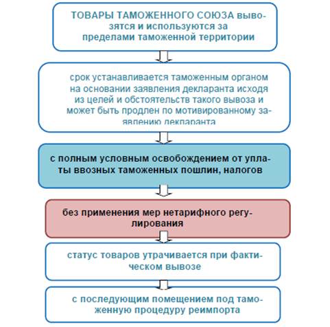 Временный вывоз - специальная таможенная процедура, при которой товары Таможенного союза вывозятся и используются в течение установленного срока за пределами таможенной территории Таможенного союза с полным освобождением от уплаты вывозных таможенных пошлин и без применения мер нетарифного регулирования с последующим помещением под таможенную процедуру реимпорта.