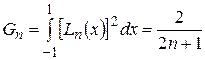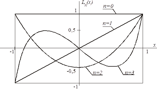 Полиномы Лежандра Ln (x) отрогональны на отрезке [–1, 1] с единичной весовой функцией h (x)=1. Они могут быть определены на основе рекурентного соотношения