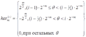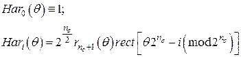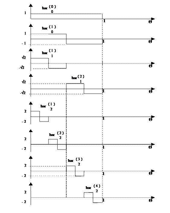 В инженерных расчетах для упорядочения базисных функций желательно использовать один индекс. В этом случае приведенные выше восемь функций Хаара можно упорядочить следующим образом: Har0(Θ), Har1(θ), Har2(θ),…, Hari(θ),…, Har7(θ). Изменение порядка индексации функций требует иного их описания.