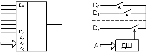 На рисунке 5.4 показано средство реализации многоканальной передачи информации: микросхема коммутаторов каналов (рисунок 5.4,а) и его функциональная схема (рисунок 5.4,б).