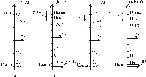 Для случая на рисунке 6.1,б начальный уровень квантования находится выше начала U мин шкалы сигнала на 0.5Δ U, а последний уровень – на 0.5Δ U