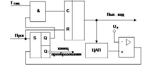 Выходной код со счетчика поступает на ЦАП. На ЦАП с каждым тактом нарастает уровень выходного сигнала на 1 шаг квантования ∆ U. Пока сигнал с выхода ЦАП не достигнет Ux, компаратор находится в состоянии «0» и триггер остается в состоянии «1». Как только сигнал ЦАП достигнет Ux компаратор переходит в состояние «1», сбрасывает триггер в «0», и тактовые импульсы на вход схемы И (&) не проходят. Процесс счета останавливается.