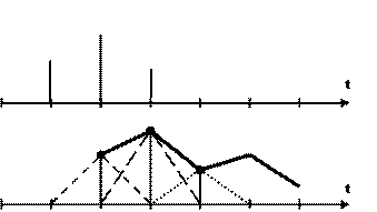Например, функция отсчета для полинома первой степени имеет вид равнобедренного треугольника. Результат построения получается с задержкой, так как построения возможны только после поступления последнего из n +1 отсчетов. При линейной интерполяции задержка равна периоду дискретизации (рисунок 8.2).