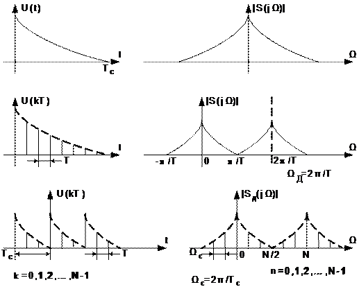 Спектр дискретного сигнала (рисунок 10.1, средний ряд, слева) становится периодическим, и период повторения спектральных составляющих определяется периодом дискретизации Т (рисунок 10.1, средний ряд, справа).