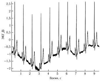 Типовой электрокардиосигнал с наиболее характерными помехами, дрейфом изолинии и наводки от сети промышленной частоты, показан на рисунке 11.1