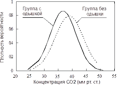 Рассмотрим следующий пример. При обследовании пациентов проводилось измерение концентрации углекислого газа в выдыхаемом воздухе. Все пациенты были разделены на две группы: 1-я группа – М 1=97 человек с жалобами на одышку, 2-я группа – М 2=68 человек без одышки.