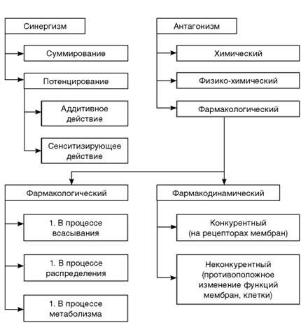 Взаимодействие лекарственных средств– изменение фармакологического эффекта одного или нескольких ЛС при одновременном или последовательном их применении (усиление эффекта – синергисты, уменьшение эффекта – антагонисты).