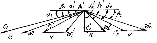 Рис.5. Треугольники скоростей активной турбины с двумя ступенями скорости.