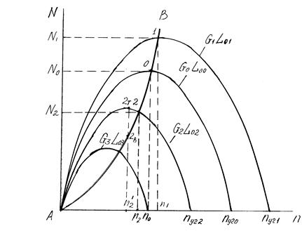 На рисунке 16. представлены мощностные характеристики турбины, каждая из которых получена при G= const и L0 =const, а так же мощностная винтовая характеристика АВ. Эти характеристики отвечают определенному комплексу условий: скорости движения судна, состоянию моря, корпуса судна, осадки, ветра, глубины воды и т.д.