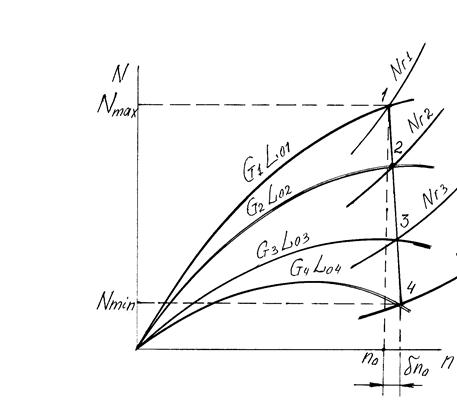 Режим совместной работы турбины и электрогенератора определяется пересечением мощностных характеристик турбины и электрогенератора (рис. 17). Линия совместной работы 1-4 (нагрузочная характеристика). При снижении нагрузки от Nmax до Nmin регулятор изменяет установку органов управления так, что от комбинации параметров G1, L01 турбина последовательно переходит на комбинацию G4, L04 . При этом мощность и частота вращения изменятся по линии 1-4.