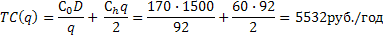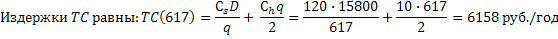 Пример 2. Определить изменение издержек в предыдущем примере 1, если годовой спрос D = 1500 единиц, стоимость подачи заказа С0=170 рублей/заказ, издержки хранения одной единицы Сh=60 рублей в год.