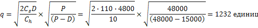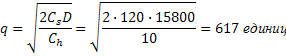 Пример 3. Годовой спрос D=15800 единиц, стоимость организации производственного цикла Сs = 120 рублей, издержки хранения одной единицы Сh=10 рублей в год. Определить экономичный размер партии.