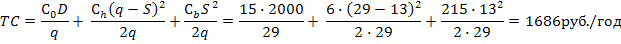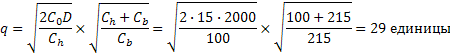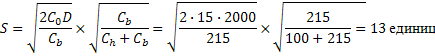 Пример 7. Годовой спрос D=2000 единиц, стоимость подачи заказов С0=15 рублей/заказ, издержки хранения одной единицы Сh=100 рублей в год, годовая стоимость отсутствия запасов