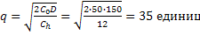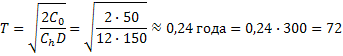 Пример 8. Средний годовой спрос D=150 единиц за 300 рабочих дней, стоимость подачи заказов С0=50 рублей/заказ, издержки хранения одной единицы Сh=12 рублей в год, годовая стоимость отсутствия запасов