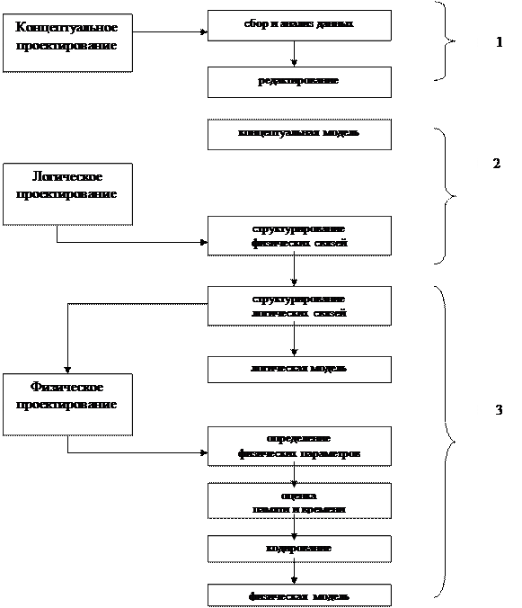 Эффективность использования БД в процессе решения задач управления экономическими объектами в значительной степени определяется правильным подходом к проектированию. Проектирование БД проходит в три этапа (рис.2.4.):