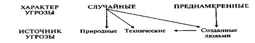 Под угрозой безопасности понимаются воздействия на систему, которые прямо или косвенно могут нанести ущерб ее безопасности. Все угрозы можно разделить по их источнику и характеру проявления на классы (рис.2.8.).