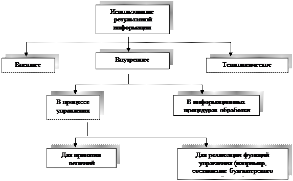 Информационный процесс управления – совокупность управленческих операций, главным предметом которых является информация. Информационный процесс управления состоит из двух частей: информационного процесса и процесса принятия управленческих решений. Информационный процесс аналогичен производству продукции с процессом получения определенного целостного по содержанию набора данных для выработки и принятия управленческих решений. Принятие управленческих решений основывается на результатной информации и является продолжением информационного процесса на высшем логическом уровне (схема использования результатной информации на рис.3.1).