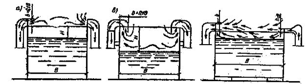 Бортовой отсос называют простым (рис. IХ.10, а), когда щели расположены в вертикальной плоскости, и опрокинутым (рис IХ.10,б), когда щели расположены горизонтально в плоскости, параллельной зеркалу ванны. Простые отсосы применяют при высоком уровне раствора в ванне, когда Н = 80-150мм; при Н = 150-300мм и более применяют опрокинутые отсосы требующие значительно меньшего расхода воздуха.