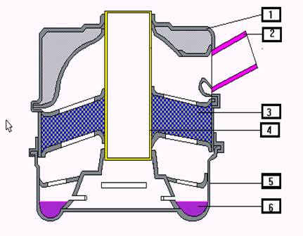 Работа фильтра. При включении компрессора в магистрали всасывания образуется разрежение и атмосферный воздух начинает всасываться внутрь корпуса через входной патрубок и попадает в съемный поддон, в который предварительно залито 400 гр компрессорного масла. Воздух, приходя в контакт с поверхностью масла, очищается от относительно крупных примесей, а затем через отверстия поступает вверх и проходит через фильтрующий элемент, которым является набивка из промасленных капроновых нитей. В этой набивке оседают более мелкие механические включения, и очищенный воздух через выходной патрубок поступает в клапанную коробку компрессора для сжатия.
