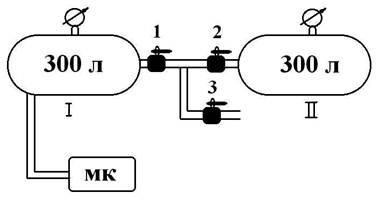Производится при изготовлении нового МК, а также в случае его ремонта на заводе-изготовителе. Для этого следует закрыть все краны, включить МК и, после увеличения давления воздуха в I резервуаре до 8 АТ, открыть полностью кран 3, а кран 1 приоткрыть так, чтобы величина давления в I резервуаре сохранилась постоянной — 8 АТ. После этого необходимо полностью открыть кран 2, а кран 3 полностью закрыть. При этом ведется наблюдение за величиной давления воздуха во II резервуаре — за 1 минуту она должна вырасти не менее, чем на 1,5 АТ