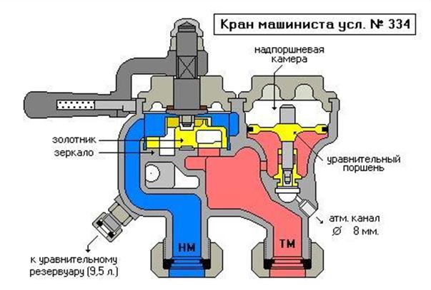 - Перевести ручку крана КМ №334 в 2-е положение и следить за давлением в уравнительном резервуаре и тормозной магистрали. При повышенном или пониженном давлении неисправен редуктор ТМ данного вагона.