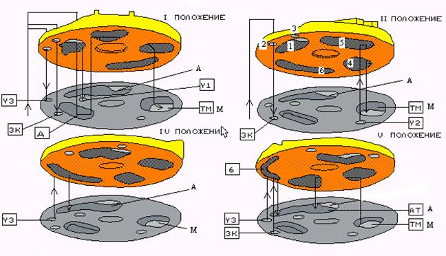Является поездным положением, при котором происходит циклическая работа редуктора ТМ по ее постоянной подпитке. К редуктору ТМ воздух подходит из золотниковой камеры (рис. 55) через сквозное отверстие золотника диаметром 7,5 мм и отверстие ЗК зеркала корпуса, диаметром 7,5 мм. В дальнейшем редуктор самостоятельно включается в работу или выключается из работы после очередной подпитки ТМ. Однако при втором положении ручки крана происходит прямое сообщение ТМ с уравнительным резервуаром через магистральное окно зеркала корпуса, пещерообразную выемку золотника и отверстие «У2» диаметром 5мм. Это означает, что при втором положении ручки крана красная стрелка двухстрелочного манометра будет показывать истинное давление воздуха в ТМ.