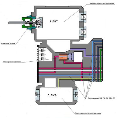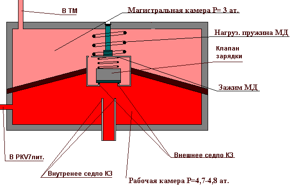 - Рабочая камера. Камера под магистральной диафрагмой. По каналу сообщается с РКV7лит., и при нейтральном положении МД, через открытое внешнее седло клапана зарядки и отверстие в верхней части зажима МД (d = 0,8 mm) с магистральной камерой.