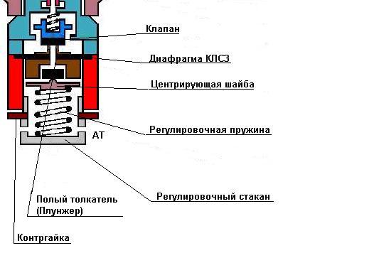 - Регулировочная пружина. Расположена в стакане. Через центрирующую шайбу нагружает диафрагму КЛСЗ снизу.