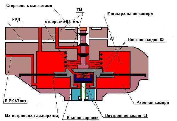 - Клапан зарядки (КЗ). Установлен внутри металлического зажима МД. Имеет возвратную пружину сверху. Клапан зарядки – двухседельчатый. Внешним седлом КЗ является кольцевой выступ отверстия в нижней части зажима МД. Внутренним седлом КЗ является верхний торец полой трубки, которая ведет в камеру над диафрагмой КЛСЗ. При нейтральном положении МД (промежуточное положение МД которое она занимает благодаря усилию нагрузочной пружины), внутреннее седло клапана зарядки всегда закрыто, а внешнее открыто и рабочая камера и РКV7лит. сообщаются с магистральной камерой и далее, по канал ТМ через ВЗ№2 с тормозной магистралью. Таким образом очевидно, что при нейтральном положении МД давление сжатого воздуха в РКV7лит., рабочей камере главной части ВР, магистральной камере и ТМ одинаково.
