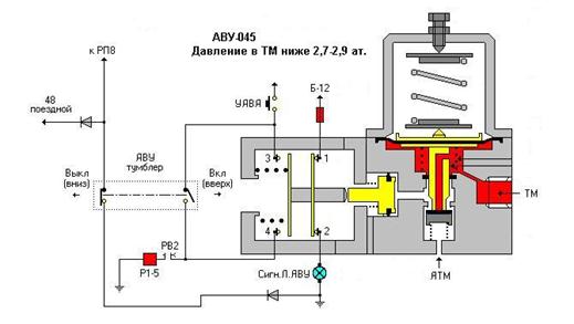 Как известно пневматический тормоз обладает так называемым «свойством мягкости», т.е. при утечке сжатого воздуха из тормозной магистрали темпом мягкости (0,3 – 0,5 ат/мин.), воздухораспределитель не осуществляет пневматического торможения. Это происходит потому, что при падении давления в магистральной камере в главной части ВР, одновременно давление падает в рабочей камере главной части ВР и в рабочей камере объемом 7 литров, так как воздух из них успевает свободно проходить через открытое, внешнее седло клапана зарядки и калиброванное отверстие d=0,8 мм. в верхней части зажима магистральной диафрагмы не вызывая разницы давления в рабочей и магистральных камерах главной части ВР. Так как такие утечки, при не своевременном обнаружении их машинистом весьма опасны, для контроля за подобными ситуациями, был разработан прибор безопасности АВУ-045. АВУ-045 предназначен для контроля за давлением в тормозной магистрали. При падении давления в тормозной магистрали ниже отметки в 2,7 – 2,9 ат., АВУ-045 размыкает свой контакт в цепи катушки Р1-5 (цепь управления) и включает ВЗ№1 на всех вагонах состава. АВУ-045 по конструкции относится к клапанно-диафрагменно-поршневым, электропневматическим приборам. АВУ-045 условно можно разделить на две части – пневматическую и электрическую (контактную). АВУ-045 установлен в кабине машиниста, перед УАВА. У машиниста, в предусмотренных случаях, есть возможность отключить АВУ-045 при помощи тумблера, который расположен на пульте и опломбирован.
