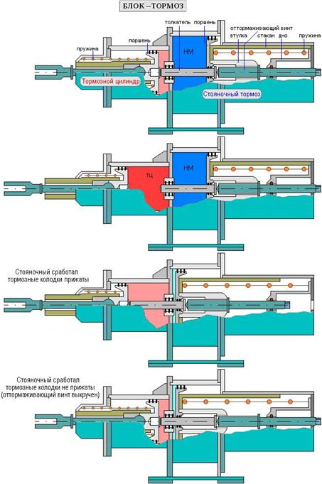 - стояночный тормоз не «держит» при его включении. Это может быть при изломе пружины СТ или из-за не полностью ввернутого оттормаживающего винта во втулку поршня СТ, т.к. в этом случае толкатель не сможет в полной мере воздействовать на поршень тормозного цилиндра по затормаживанию.
