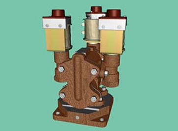 - Электромагнитный вентиль. В ДВР установлены 3 электромагнитных вентиля выключающего типа. Вентиль №1 предназначен для открытия левых дверей на вагоне, вентиль №2 предназначен для открытия правых дверей на вагоне, вентиль №3 предназначен для закрытия дверей с обеих сторон вагона. Сверху на вентилях имеются кнопки, при помощи которых можно открыть-закрыть двери на вагоне.