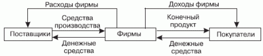 Кругооборот капитала на микроуровне. Простейшей схемой кругооборота является взаимодействие фирмы с поставщиками и потребителями. От поставщиков фирма получает оборудование, сырье, материалы, а также труд в виде рабочей силы, т. е. вещественные и личные факторы производства. За них фирма направляет поставщикам денежные средства, которые составляют ее расходы.