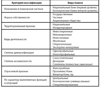 По положению в банковской системе различают национальный банк (первый уровень) и коммерческие банки (второй уровень). По форме собственности – государственные, частные и акционерные банки. По территориальному признаку выделяют национальные и международные банки; по видам деятельности – инвестиционные, инновационные, эмиссионные, ипотечные, сберегательные, экспортно-импортные; по степени диверсификации – однопрофильные и многопрофильные; по степени независимости – самостоятельные, дочерние, сателлиты (полностью зависимые).