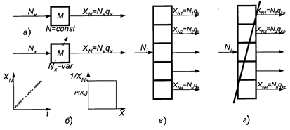 Рис.5.1. Разновидности мер: а - одноканальная нерегулируемая; б - одноканальная регулируемая; в - многоканальная нерегулируемая; г - многоканальная регулируемая Многозначная мера может быть: одноканальной регулируемой (рис.5.1, б), когда в данный момент времени воспроизводится только один размер. т.е. осуществляется временное разделение величин (например, магазин емкостей), ее уравнение xN=Nxq; Nx=var; qk=const; многоканальный нерегулируемой (рис.5.1, в), одновременно воспроизводящей несколько размеров заданной величины (например, нерегулируемый делитель напряжения), ее уравнение xNi=Niqk=const; многоканальной регулируемой, воспроизводящей одновременно несколько величин, размеры которых могут изменяться (рис.5.1, г), ее уравнение