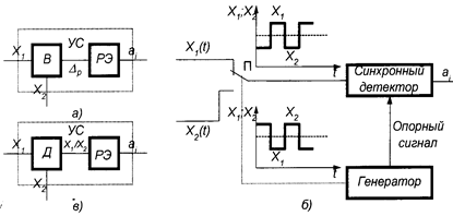 Характерной особенностью многоканальных мер является пространственное разделение выходных величин. Другой важнейшей операцией, входящей в процедуру измерения, является сравнение величин, под которым понимается определение соотношения однородных величин по знаку их разности (иногда по другому признаку). Совокупность и последовательность выполнения приемов использования физических принципов и явлений, необходимых для осуществления сравнения величин, называют методом сравнения, а соответствующее техническое средство - устройством сравнения (УС). Устройство сравнения чаще всего состоит (рис.5.2, а) из вычитателя В, создающего разность сравниваемых сигналов Dp=x1-x2, и релейного элемента (РЭ), реагирующего на знак разности Dp. В аналоговых устройствах релейный элемент часто отсутствует. Сравнение может быть одно- и разновременным. Если осуществляется операция одновременного вычитания, то УС реализуется двухканальной структурой (рис.5.2, а). Выходной сигнал ai, несущий информацию о результате сравнения, чаще всего представляется логическими "1" или "0":