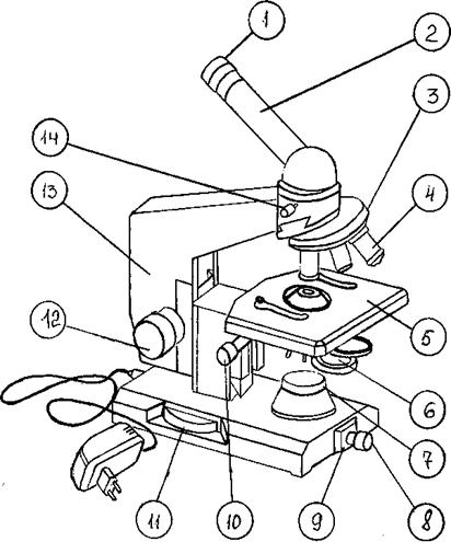 | 1 – окуляр 2 – монокулярная насадка (тубус) 3 – револьверное устройство 4 - объектив 5 – предметный столик 6 - конденсор 7 – корпус коллекторной линзы 8 – патрон с лампой 9 - шарнир 10 – рукоятка перемещения кронштейна конденсора 11– рукоятка тонкой фокусировки (микрометрический винт) 12 – рукоятка грубой фокусировки (макрометрический винт) 13 - тубусодержатель 14 – винт для крепления насадки |