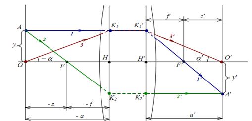 | Формула отрезков или формула Гаусса f’ /a’+ f /a=1 | (12) |