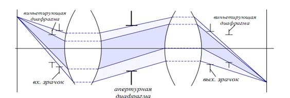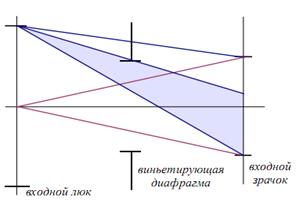 Если внеосевые пучки дополнительно ограничиваются помимо апертурной диафрагмы другими диафрагмами, то зрачок заполняется не полностью. Это дополнительное ограничение или срезание пучков называется виньетированием.